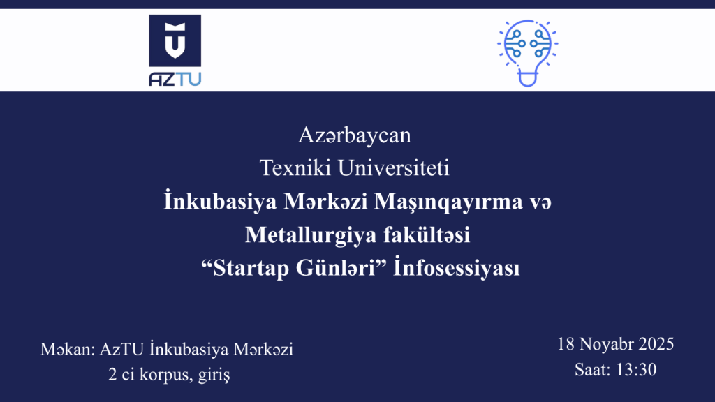 💡 AzTU İnkubasiya Mərkəzində Maşınqayırma və Metallurgiya fakültəsi üçün ‘Startap Günləri’ infosessiyası keçiriləcək!