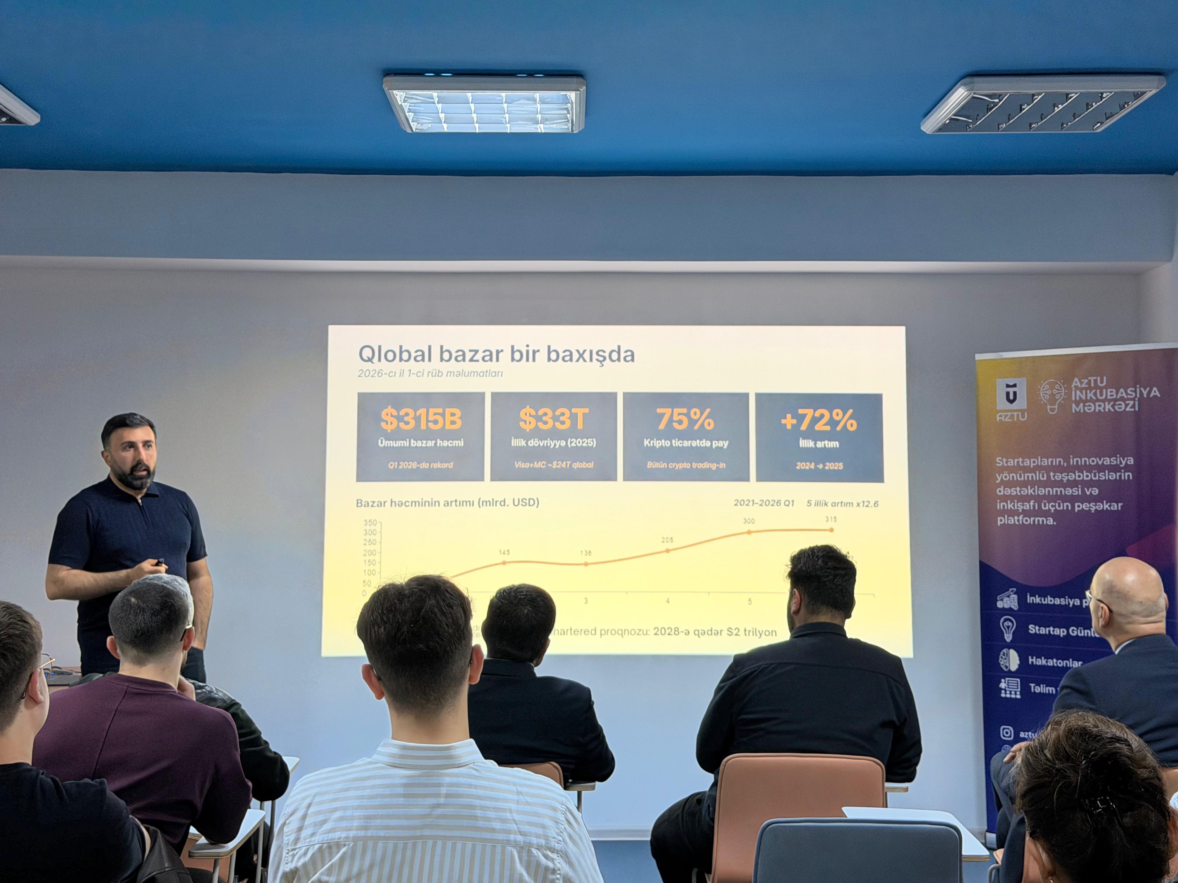 Daha sonra Blockchain Azərbaycan Mərkəzinin üzvü Orxan Əhmədov (BonPara, CInS, AInA layihələrinin təsisçisi) çıxış edərək fintech, AI və blokçeyn texnologiyalarının inteqrasiyası, stablecoinlərin real biznes modellərində tətbiqi və bazar imkanları barədə təqdimatla çıxış etmişdir.